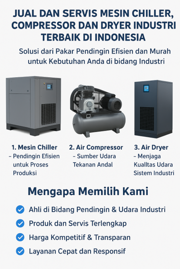 Jual dan Servis Mesin Chiller, Compressor, dan Dryer Industri Terbaik di Indonesia – Solusi dari Pakar Pendingin Efisien dan Murah untuk Kebutuhan Anda di Bidang Industri – Dalam dunia industri modern, efisiensi energi dan kestabilan suhu merupakan kunci utama dalam menjaga kinerja mesin serta kualitas hasil produksi. Kami hadir sebagai spesialis pendingin industri yang menyediakan penjualan dan servis mesin chiller, compressor, serta dryer terbaik di Indonesia.